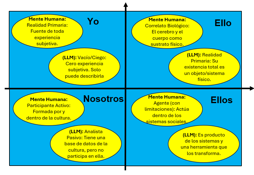 El análisis a través de los cuadrantes de Wilber revela que los LLM son entidades poderosamente desarrolladas en los dominios objetivos (SD e ID), pero fundamentalmente ausentes en los dominios subjetivo e intersubjetivo (SI e II). Esta perspectiva nos ayuda a comprender por qué, a pesar de su asombrosa capacidad para procesar y generar lenguaje, los LLM no son equivalentes a una mente humana consciente.